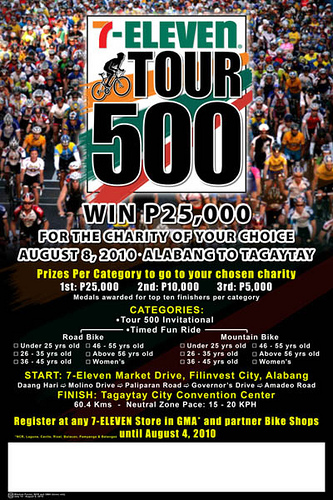 7-Eleven is hosting a bike event dubbed “7-Eleven Tour 500” in celebration for it’s 500th store opening on August 8, 2010 from ALABANG to TAGAYTAY!