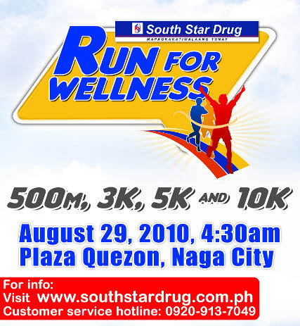 A fun run dedicated for your wellness, South Star Drug is bringing us Run For Wellness 2010, happening on August 29, 2010 at Plaza Quezon, Naga City.