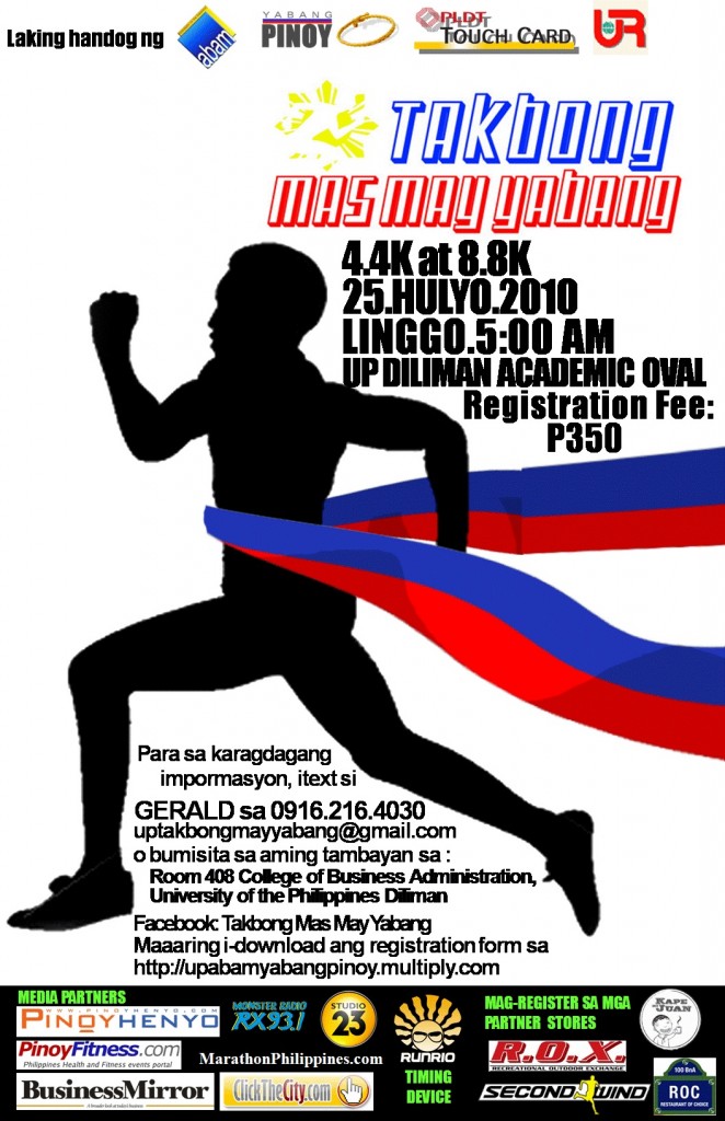 Together let’s uplift the Filipino Pride by supporting the UP Association of Business Administration Majors (ABAM) together with Yabang Pinoy as they host a fun run event entitled Takbong Mas May Yabang 2010, happening on July 25, 2010 at the UP Diliman Academic Oval.
