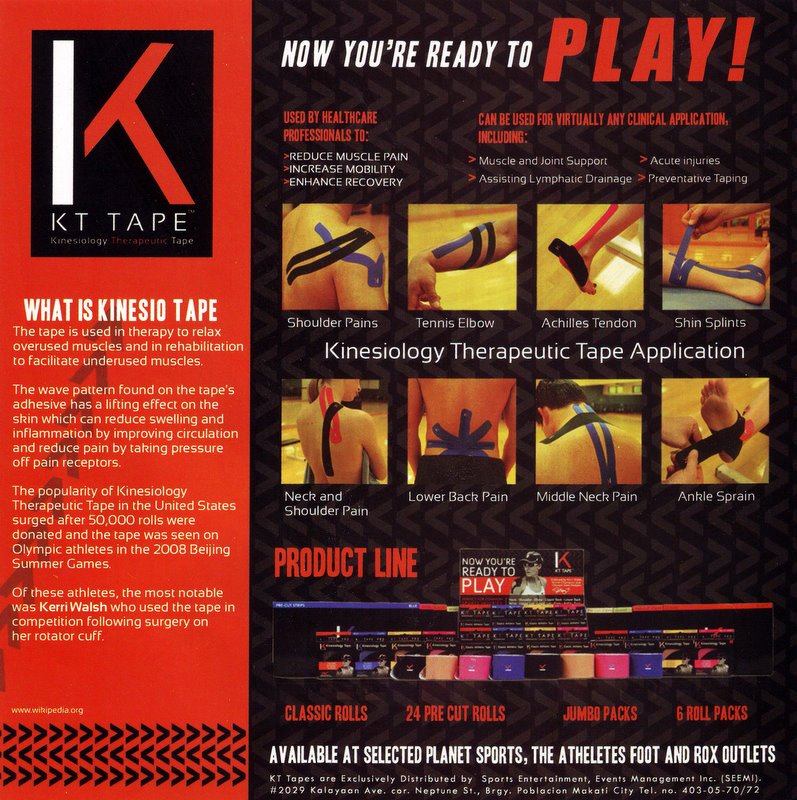 KT Tape is applied along the muscles, ligaments and tendons (soft tissue) to speed up recovery of muscles by providing a lightweight, strong, external support and it comes in different colors: black, blue, pink, beige, red and green priced at PHP 735.00