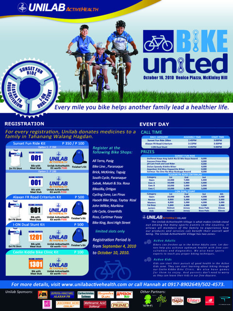 Bike United gathers weekend warriors and competitive bikers for a day of wellness and active health. It is a part of the Unilab ActiveHealth advocacy. Bike United will be held on October 16, 2010 at the Venice Piazza, McKinley and will be participated in by close to 1,500 biking enthusiasts