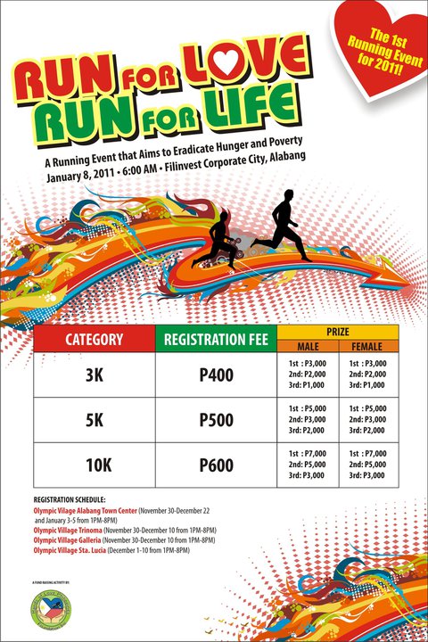 Here’s a fun run dedicated for Love and Life that aims to eradicate hunger and poverty. To be scheduled on January 8, 2011, more information to follow once it’s available.