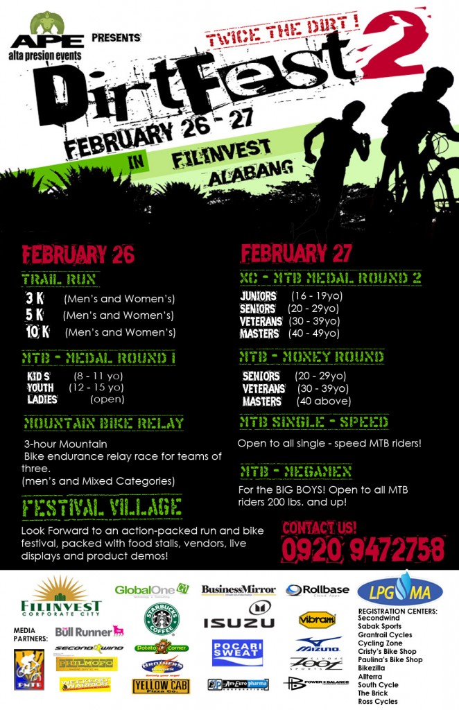 Dirt Fest 2 – Twice the Dirt happening on February 26 -27, 2011 features a 3k, 5k, 10k Trail Run, 3 hour Mountain Bike Relay (teams of three), Cross Country Mountain Bike Races for all age categories, Kids, Ladies, Single Speed and Megaman Divisions and a Festival Village with food stalls, merchandise and product demos