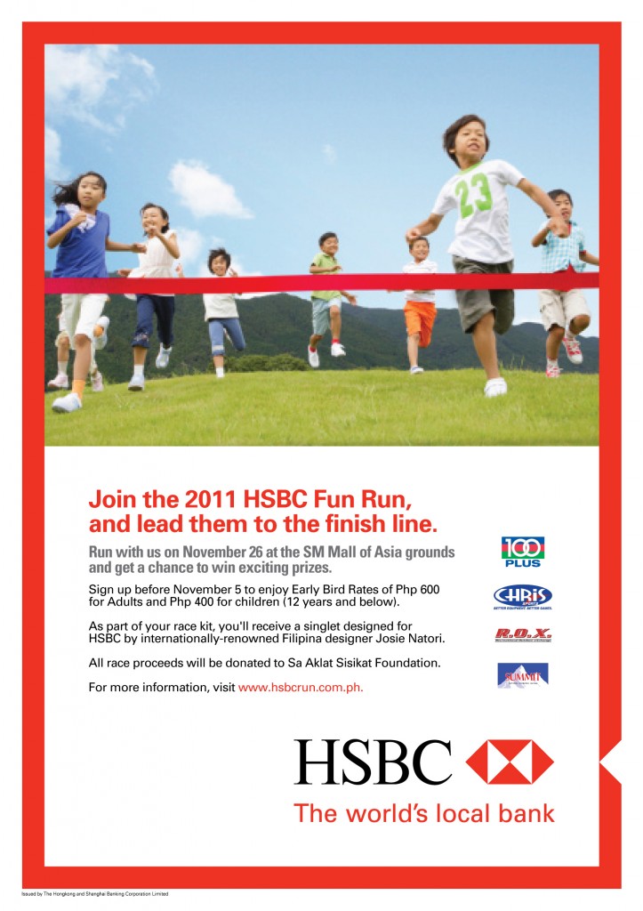 This year the HSBC Fun Run is scheduled to take place on November 26, 2011 at the SM Mall of Asia. Adding this to the calendar, Check it out!