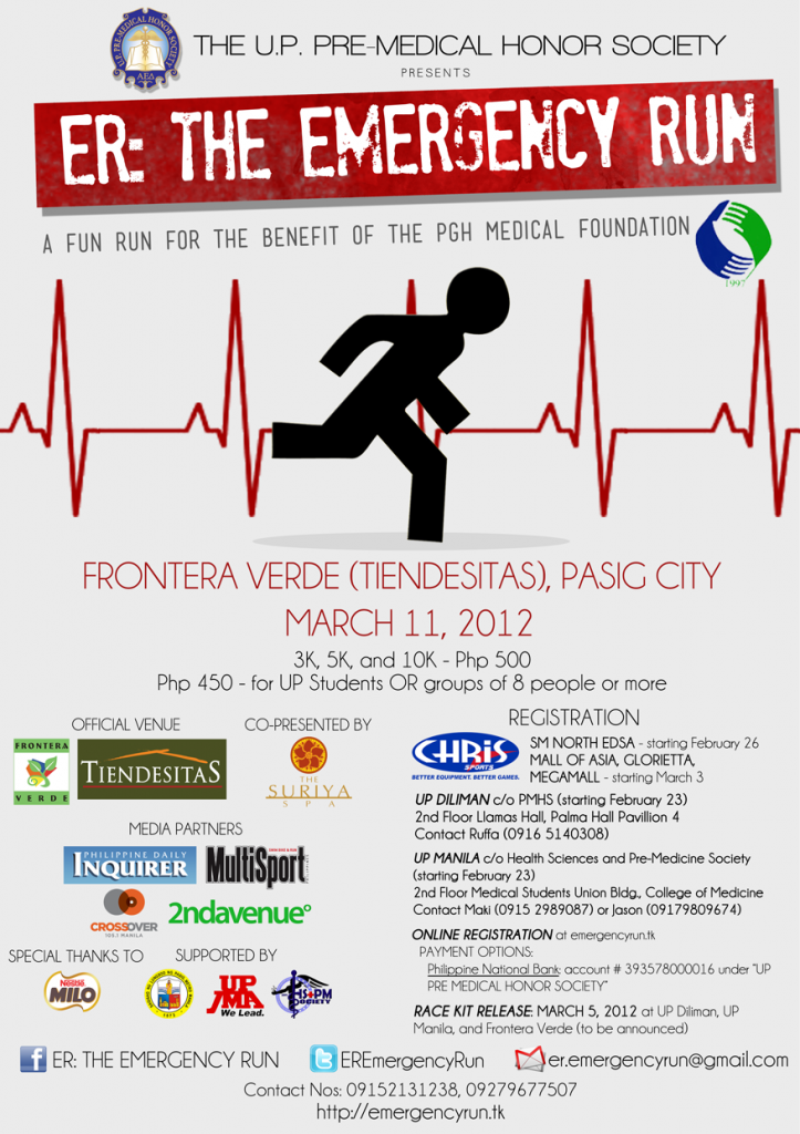 The charity fun run with the title ER: The Emergency Run coming this March 11, 2012, is a partnership between the UP Pre-Medical Honor Society and The Philippine General Hospital Medical Foundation, Inc. UP PMHS aims to raise funds to aid in covering the operational expenses of the Philippine General Hospital.