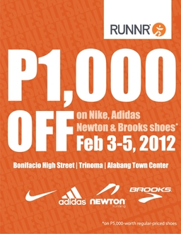 Hurry! From Februray 3 to 5 RUNNR store in BGC, Trinoma and Alabang is giving away P1,000 pesos OFF NIKE, ADIDAS, NEWTON and BROOKS Shoes! If you’re thinking of buying a new pair of shoes, stop thinking and go to the nearest RUNNR Store!