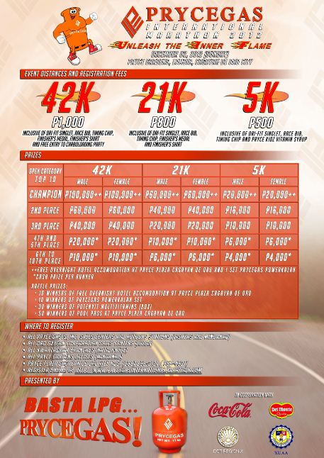 The PRYCEGAS INTERNATIONAL MARATHON – Unleash the Inner Flame is the biggest running event ever to be staged in Cagayan de Oro City, the City of Golden Friendship and Northern Mindanao. This competition has a running distance of 42k, 21k & 5k. PRYCEGAS has allotted the Biggest Cash Prize ( amounting to Php 1 Million) is at stake for the winners on all categories vying for the Top 10 Male & Female Finishers. This race will use a State of the Art Timing System for all categories.