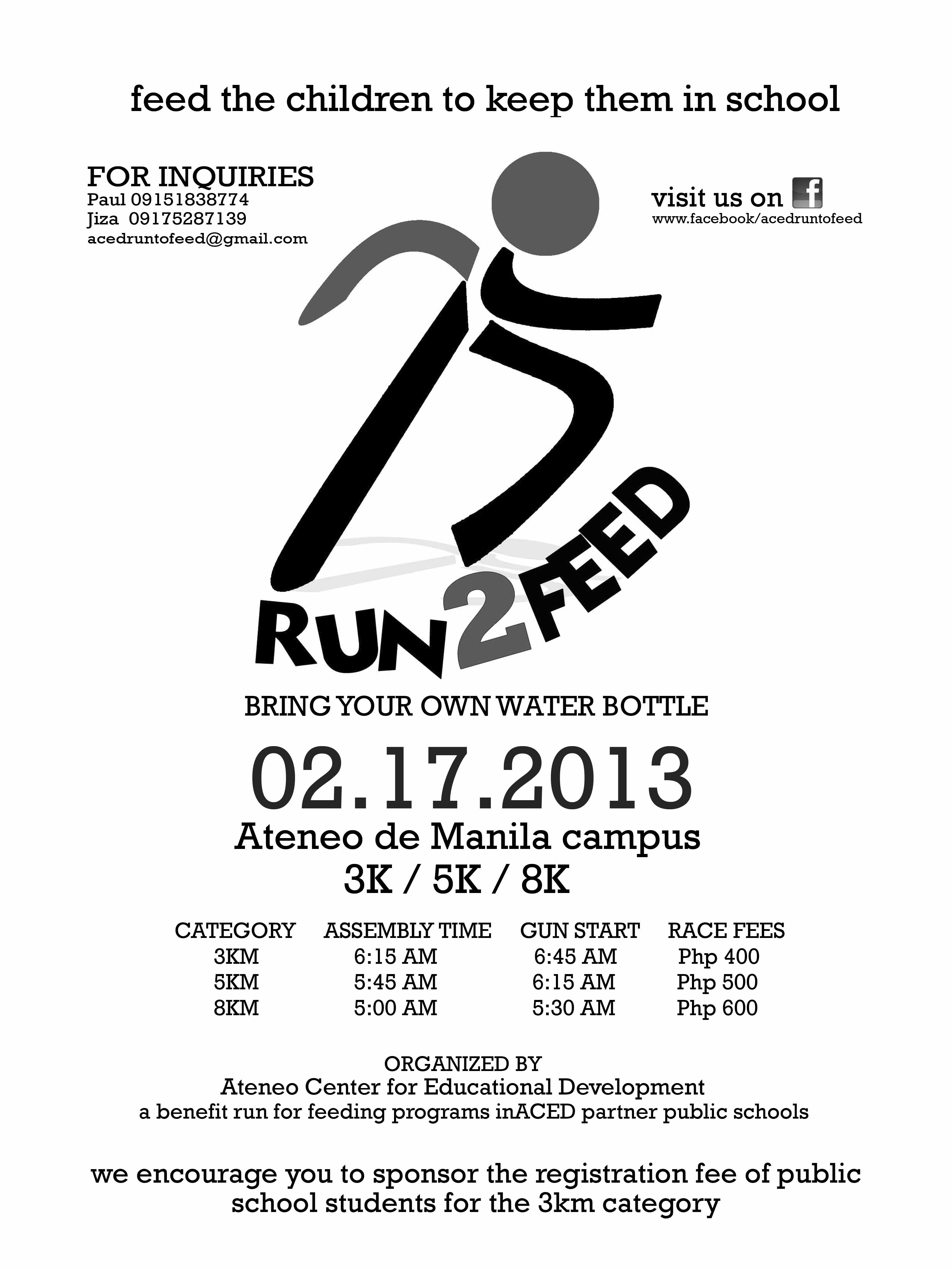 The Ateneo Center for Educational Development(ACED), the arm of the Ateneo de Manila University in helping uplift public basic education in the country, will once again host a fun run on February 17, 2013 (Sunday). Dubbed Run 2 Feed, it will be the second fun run ACED is organizing to raise money, support, and awareness of ACED’s work toward public school development, particularly its feeding programs in public elementary schools, which include those in Quezon City, Parañaque, Valenzuela, and Bacnotan (La Union).