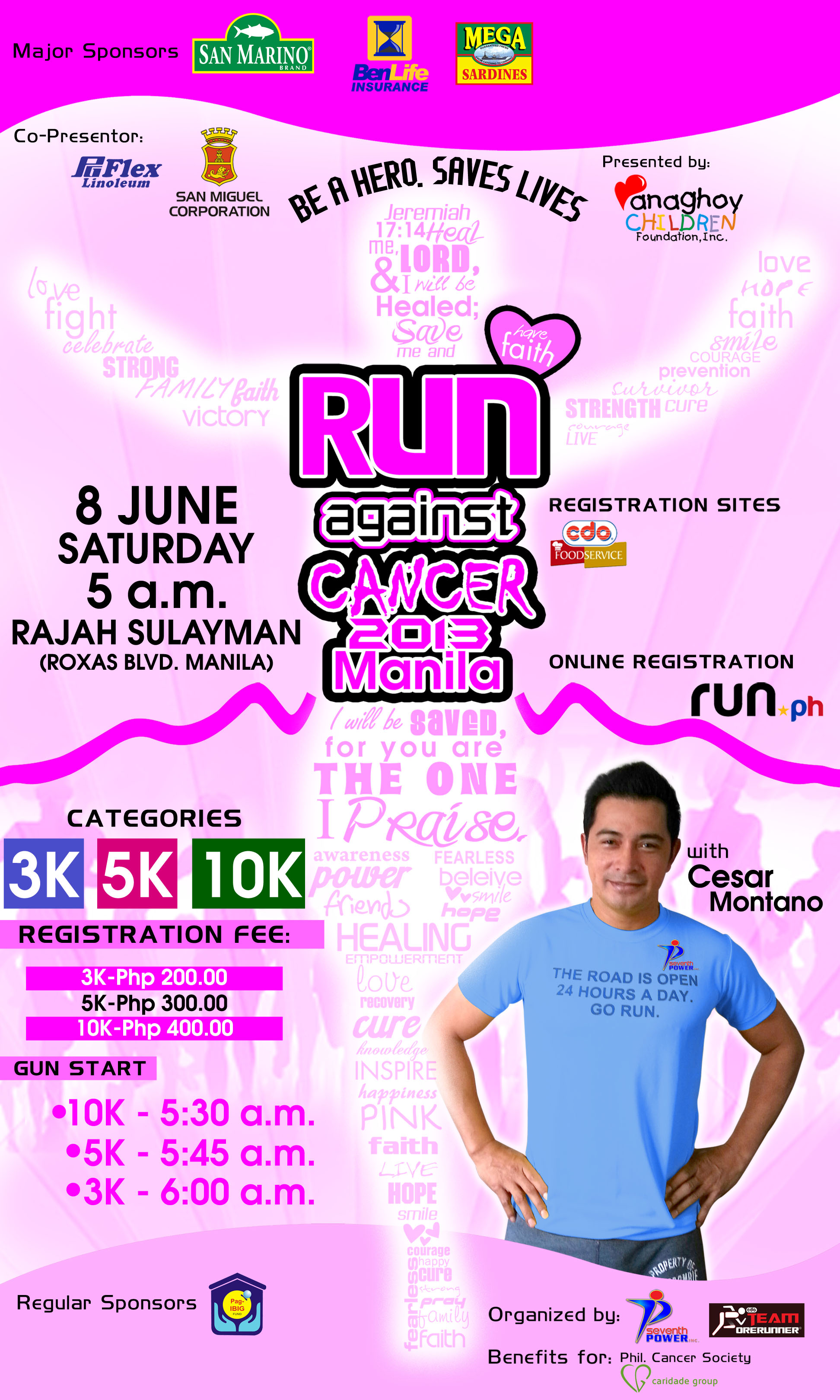 Run Against Cancer 2013 Manila will be held on June 8, 2013 at Raja Soliman Roxas Boulevard Manila. The proceeds of this event will be donated to the Philippine Cancer Society, Ospital ng Maynila, Caridade Group and the Panaghoy Children Foundation.