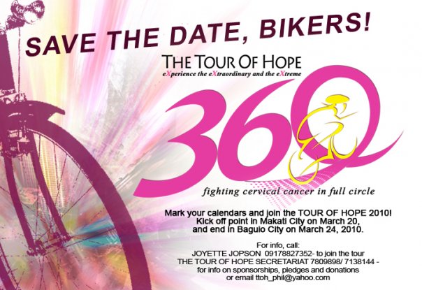 The Tour of Hope Philippines 2010, “360: Fighting Cervical Cancer in Full Circle” is all set on March 20 – 24, 2010. We will be riding from Makati City to Baguio City to help spread the word on the fight against the disease.