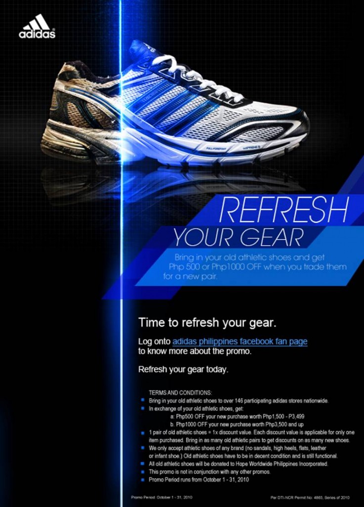 – Bring in your old athletic shoes to over 146 participating Adidas stores nationwide