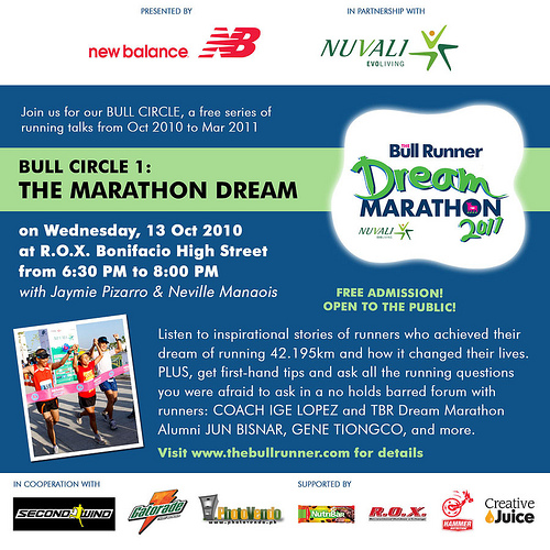 Join Jaymie and the Bull Runner Crew for the first Bull Circle happening on October 13, 2010. Bull Circle is a series of FREE running talks from October 2010 to March 2011 before the TBR Dream Marathon on March 20, 2011