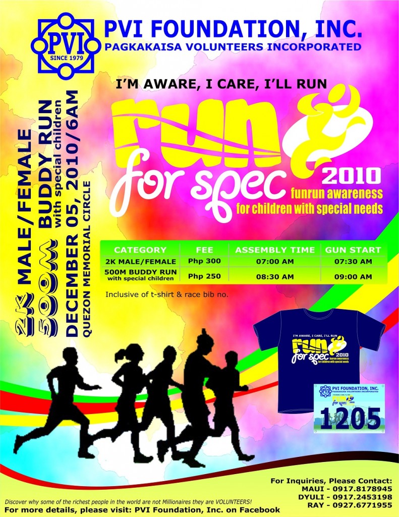 On DECEMBER 5, 2010 the PVI foundation will be holding a “RUN4SPEC (A Fun Run Awareness for Children with Special Needs)” at QUEZON MEMORIAL CIRCLE (Runnex Area) registration starts at 5:00 AM.