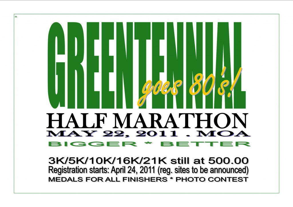 The most exciting race is back! the Greentennial team is making it BIGGER! BETTER! with the Greentennial Half Marathon! Happening on May 22, 2011 at the Mall Of Asia with a theme ‘back to the 80s’!