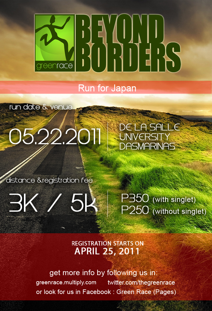 Here is another race for the benefit of the ongoing relief operation in Japan, GSB-Prodman is organizing Green Race: Beyond Borders happening on May 22, 2011 at DLSU-Dasmarinas, Cavite
