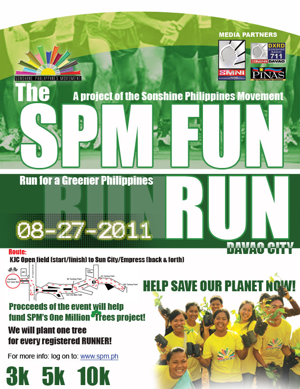 SPM Fun Run 2011 at Davao will be held on August 27, 2011, the proceeds of this activity will be donated to the Sonshine Philippines Movement’s project to plant One Million Trees in support to the government’s “NATIONAL GREENING PROGRAM”.