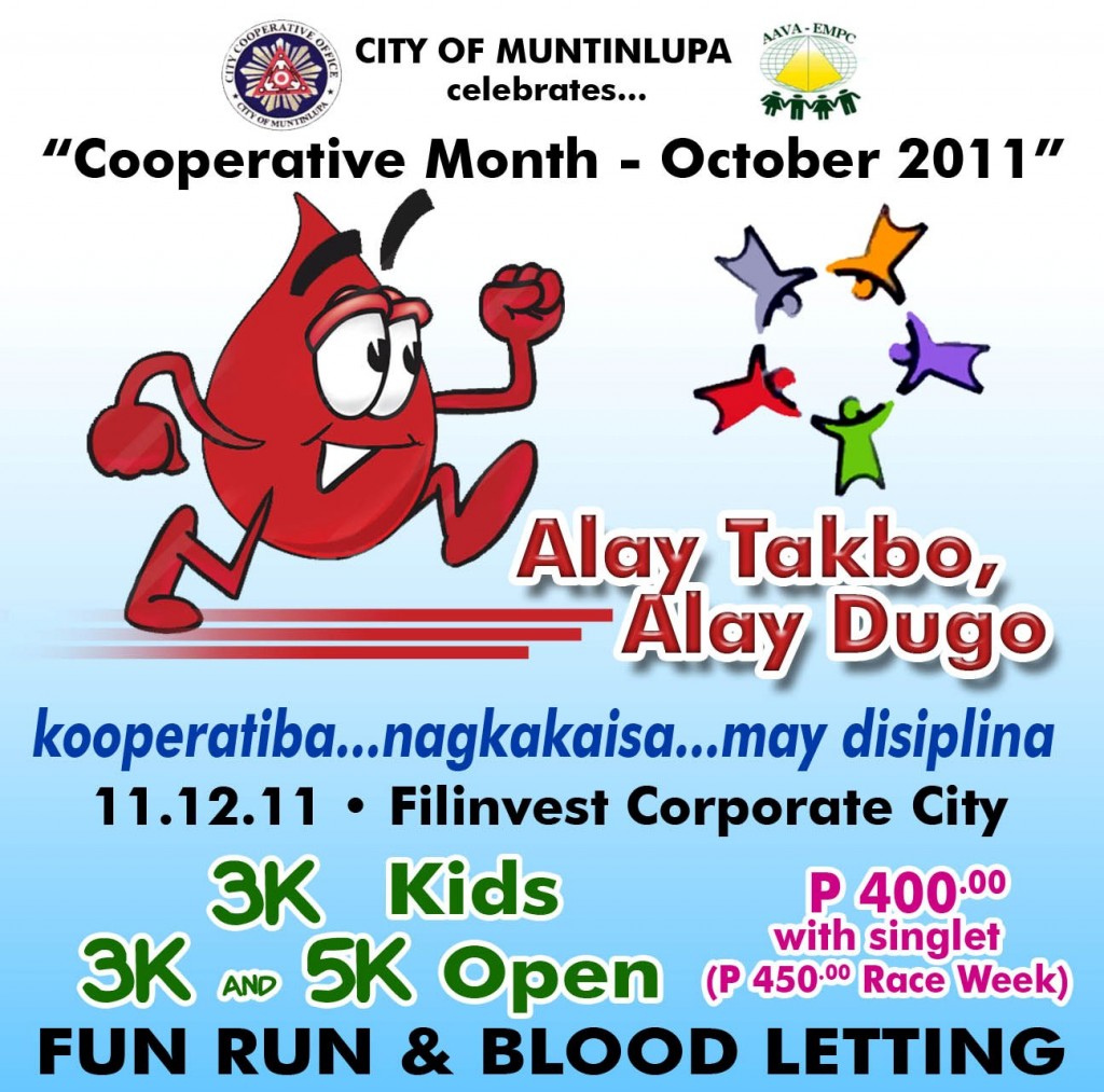 City of Muntinlupa celebrates Coorperative month of October 2011 with Alay Takbo, Alay Dugo Fun Run scheduled on November 12, 2011. Check it out!