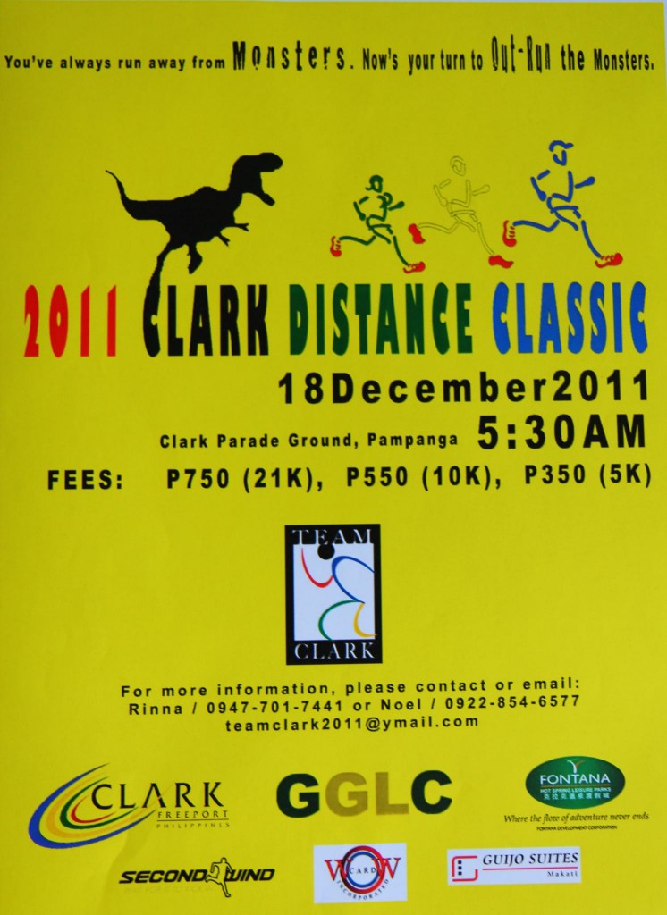 The 2011 Clark Distance Classic will be held on December 18, 2011 at the Clark Parade Ground, Pampanga. There will be a 5K, 10K and 21K events. Unleash the monster in you with this event.