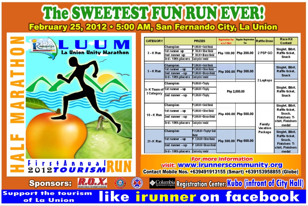 La Union is 4 to 5hours away from Manila and i assure you that you wont regret joining this Event; the first of its kind here in Ilocandia sa marami pong kadahilanan: Starting Feb24, 2012 the Province of La Union particularly here in San Fernando is bustling with activities in celebration of our Provincehood,napakaraming pakulo, fiesta activities, tiangge etc, etc, na masasaksihan ninyo dito. You will not only get the chance to Run the most beautiful running route in this part of country you can also taste the Festivities La Union offers to local and international Tourist.