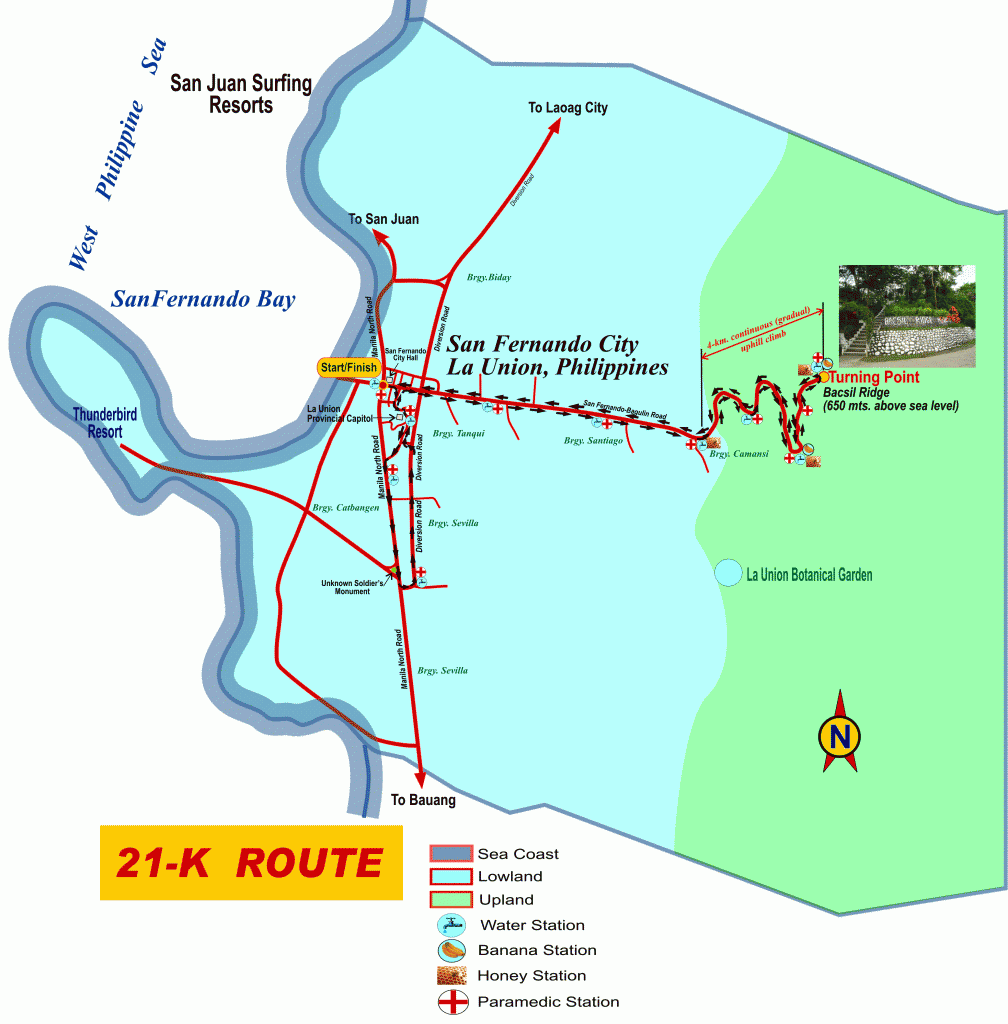 (2) the event features the best running route in the north or the Bacsil Ridge: (a)the ridge features a gradual 5kilometer climb of almost 700 ft above sea level elevation (b) the ridge is the haven for mountain bikers not only because of its elevation but also because of the lush vegetation or forest that encapsulate the whole ridge. (c) the ridge is the best elevated site to wonder at the beautiful San Juan bay which is highly popular for Surfing; the San Fernando Bay where the famous Thunderbird resort and Wallace Air Station is situated; the green and beautiful on-top-of-the-hill view of Mountainous part of Town of San Gabriel and Town of Luna La Union!