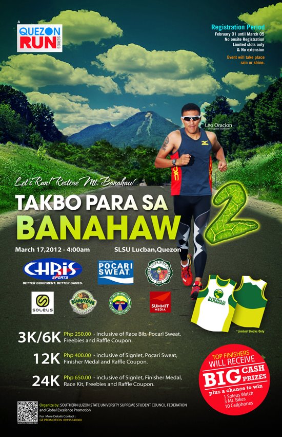Takbo para sa Banahaw part 2 – is a project of Southern Luzon State University Student Council Federation in partnership with the Global Excellence Promotion. It’s their 2nd straight year to sponsor such event and this year with the addition of Quezon Run organizers. the goal is to make it the biggest run in Quezon Province targeting an at least 6,000 participants. It has 4 categories 24km/12km/6km/3km. We are inviting everyone to be part of this big running event.