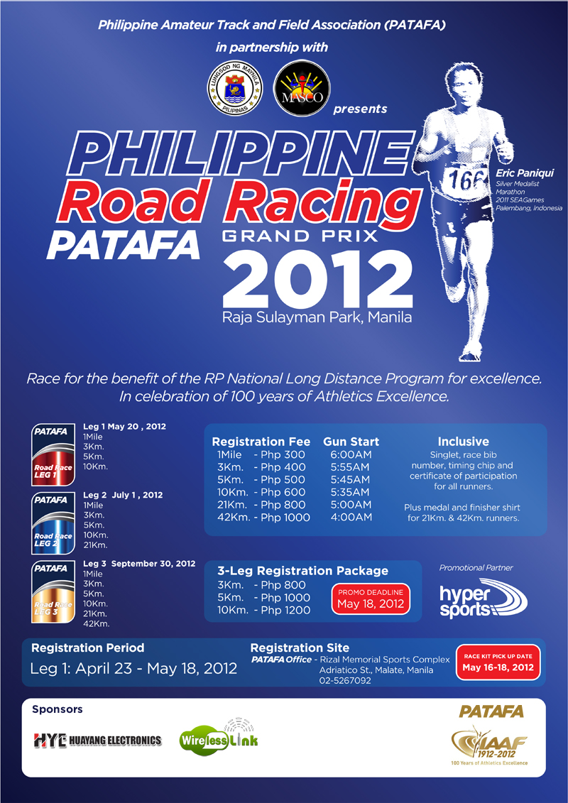 Our national agency for road running association, Philippine Amateur Track and Field association (PATAFA), launches 3-leg running grand prix this coming May 20, July 1 and Sept 30 in Quirino granstand. This is to motivate all runners of different skills and strength levels to try and complete the grand prix which promotes continuous and progression of running distance.
