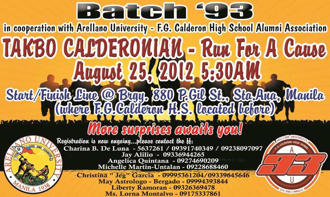 Batch’93 of Arellano University, Felipe G. Calderon High School Sta. Ana, Manila presents Takbo Calderonian – Run for a cause for the benefits of Dental Mission for Bgy 880 Sta. Ana, Manila and Golden Acres.