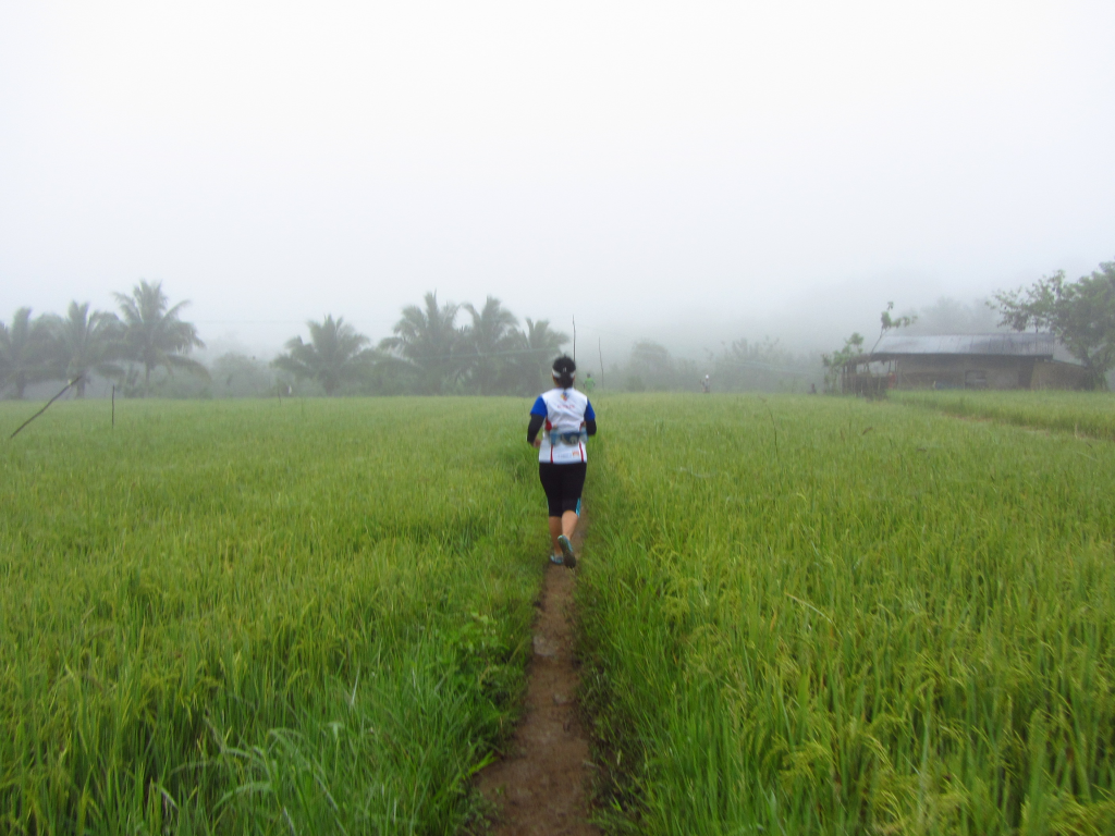 After taking some photos, we resume running our way up. Upon reaching the mountain top, there was a banana station where a lot of runners took a break to hydrate, re-fuel and rested. According to a runner, there was traffic going down as runners descend singly on a challenging route. We took this opportunity for more photo ops. Afterwards, we then proceeded to the other side and saw runners getting their way down. It looks difficult and slippery going down and some runners were already screaming and laughing. I held on grasses while descending to prevent myself from tipping down. At some point, I had to sit and slide to descend the steep downhill because it was safer than standing up. I was laughing as I enjoy my way down.