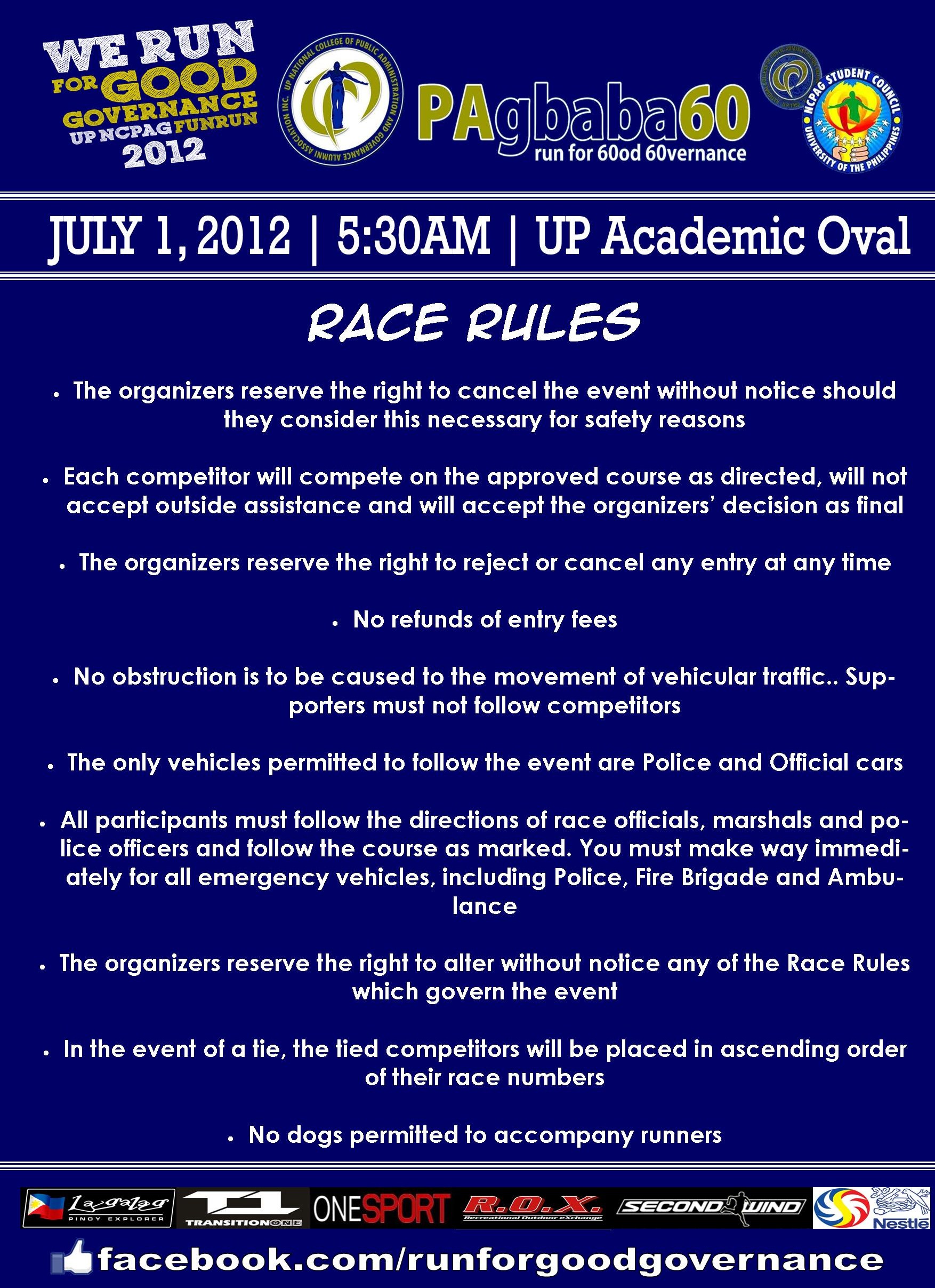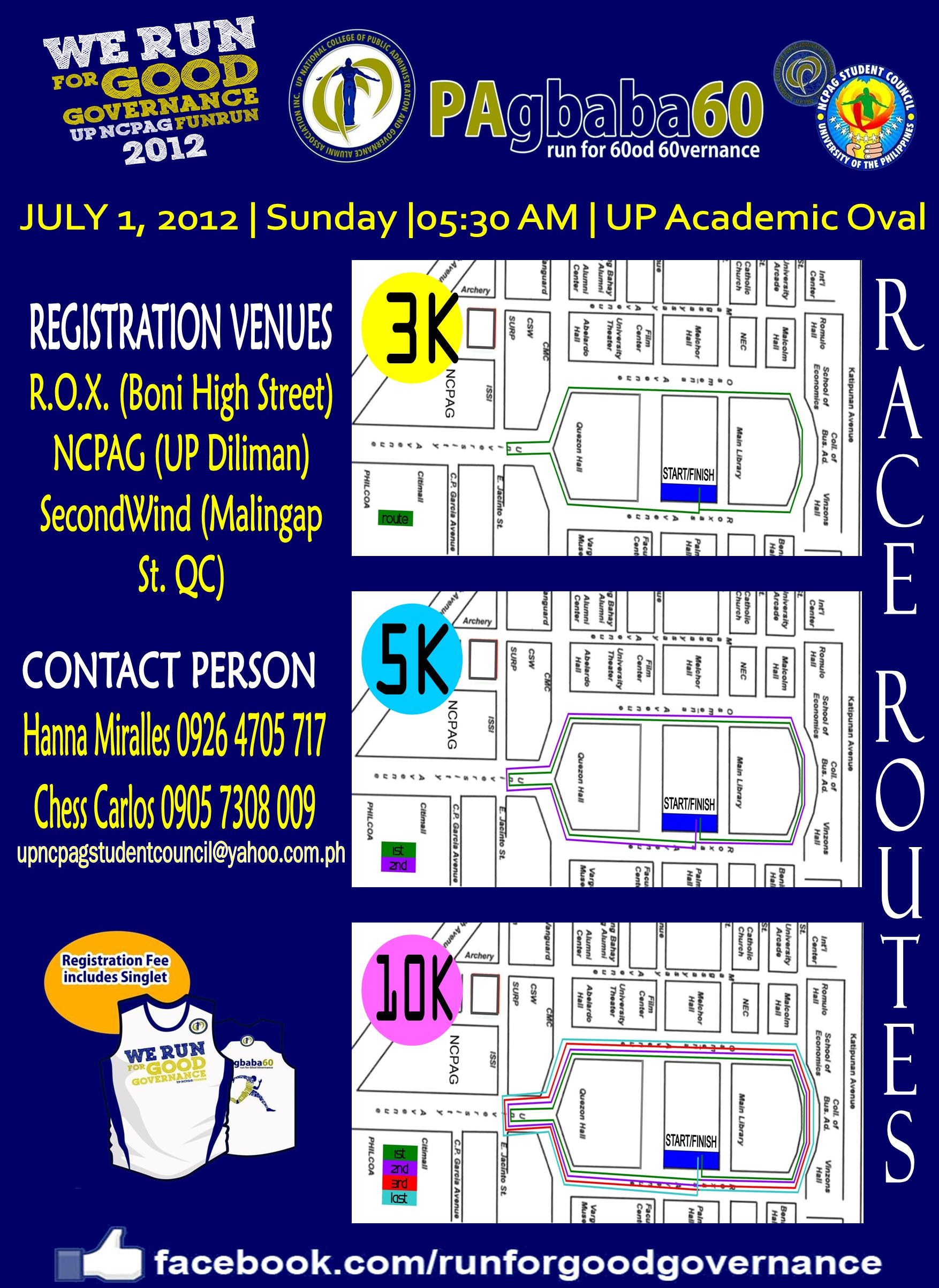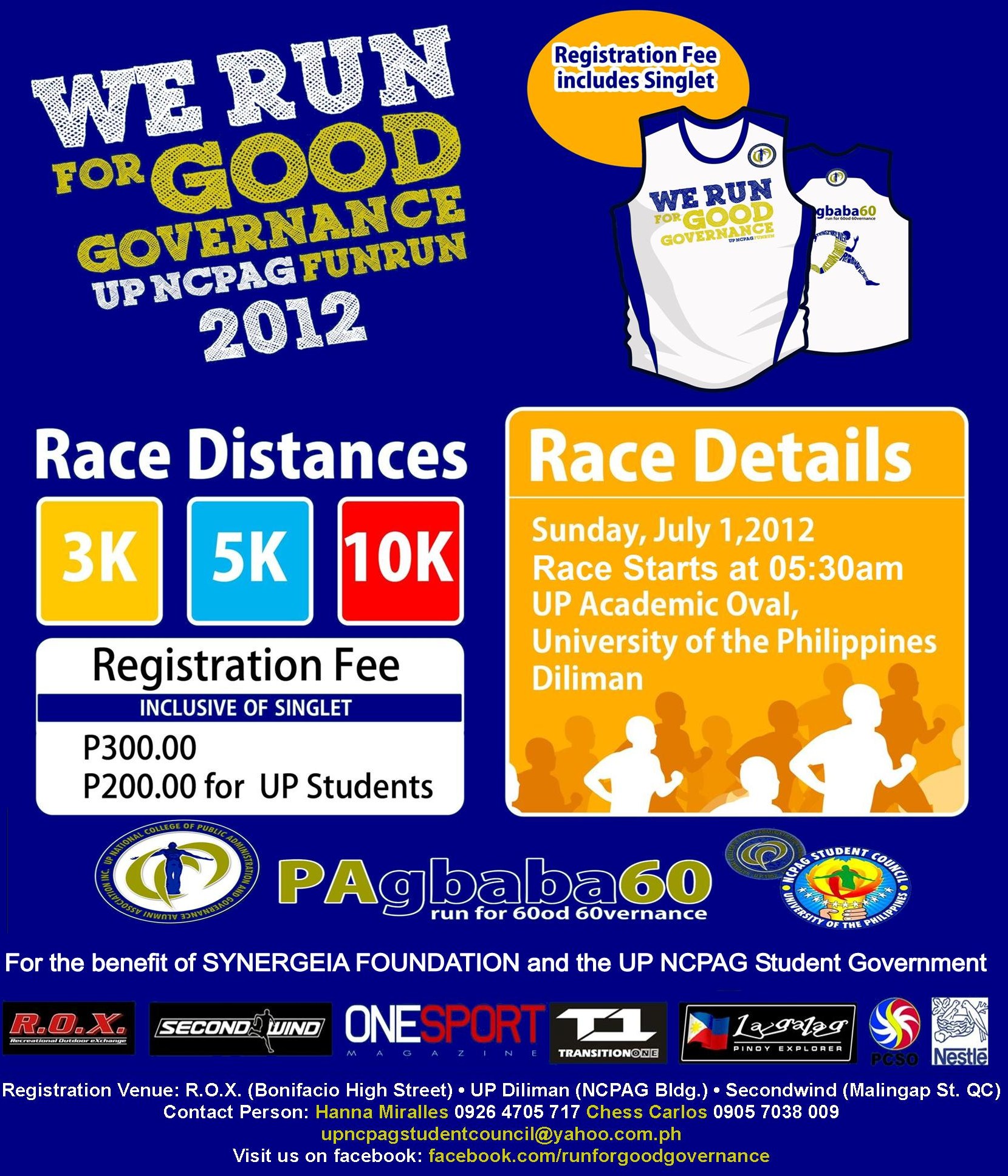 PAgbaba60: A Run for Good Governance is a run for the benefit of Synergeia Foundation and UP NCPAG Student Government happening this July 1, 2012 at UP Diliman.