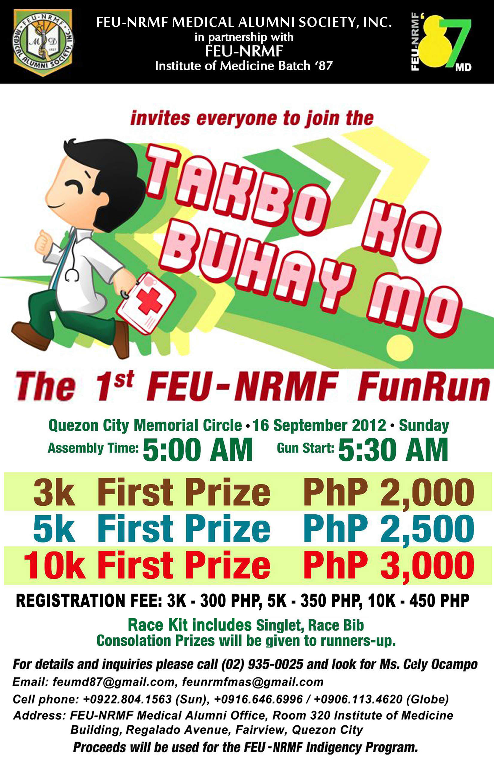 The FEU-NRMF Medical Alumni Association in partnership with the FEU-NRMF Institute of Medicine Batch ’87, in celebration of the latter’s Silver Jubilee this year, is organizing the “TAKBO KO, BUHAY MO” The 1st FEUNRMF-IM Fun Run on “TAKBO KO, BUHAY MO” The 1st FEUNRMF-IM Fun Run on September 16, 2012 at the Quezon Memorial Circle, Quezon City.