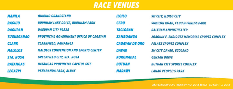 Runners will converge in 18 major cities that include: Manila, Baguio, Dagupan, Tuguegarao, Clark, Malolos, Sta. Rosa, Batangas, Legazpi, Iloilo, Cebu, Tacloban, Zamboanga, Iligan, Davao, Koronadal, Butuan, and Marawi.