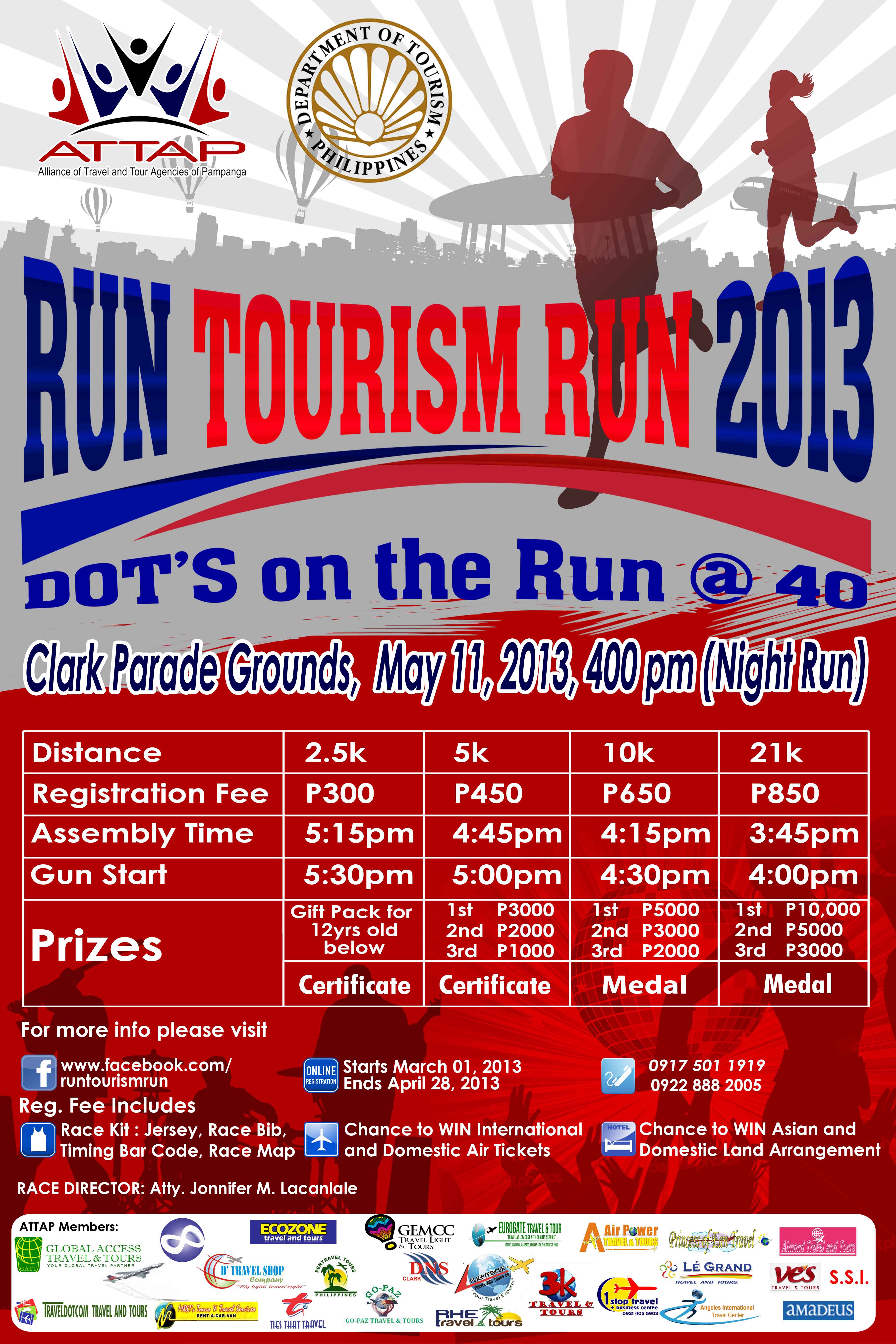ATTAP in cooperation with DOT Region 3 will hold the “Run Tourism Run 2013 … DOT on the run @40”. This is a night run at Parade Ground, Clark Pampanga.
