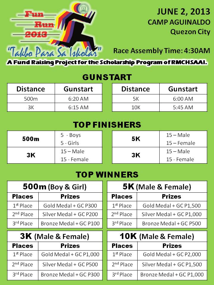 Takbo Para Sa Iskolar will be held at Camp Aguinaldo, Quezon City. A Fund Raising Project for the Scholarship Program of RMCHSAAI.