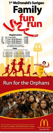 McDonalds Family Fun Run 2013 Surigao is happening on July 28, 2013. This event is for the benefit of Orphans of Surigao City. Check out details below.