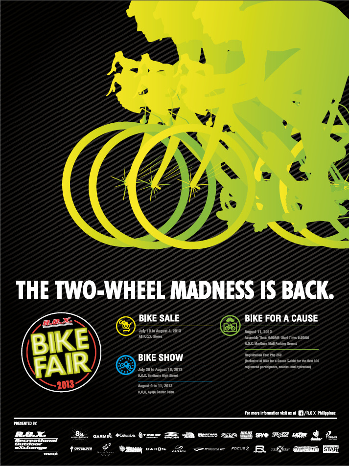 BIKE FAIR A month long different Bike activities from July 19 to August 18, 2013 which includes a Bike SALE, Bike for a Cause and Bike Show!