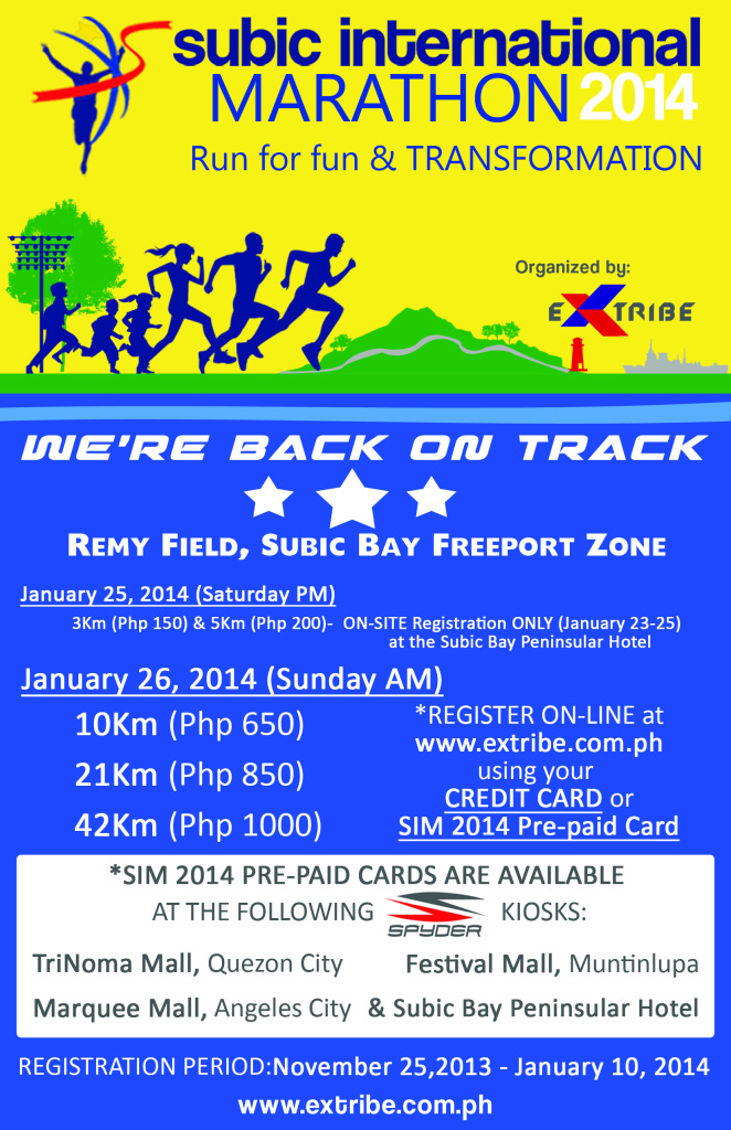 The first marathon of the year is back! Subic International Marathon 2014 is already scheduled to happen on January 25-26, 2014 with 3K, 5K, 10K, 21K and 42K categories, still a lot of time to start training!