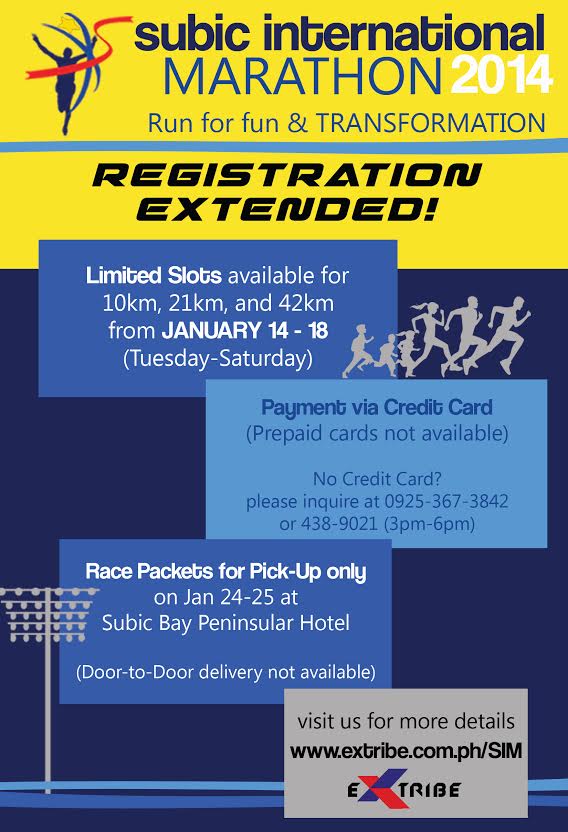 Hi, yes, registration will be extended. It will reopen tomorrow (Jan14) until Saturday. You can check out the Subic International Marathon FB Page for more details.