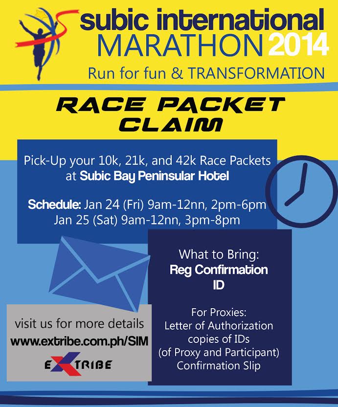 We’ve extended the race packet claiming period. You may now also claim your race kits from 3pm-8pm on Saturday. ou can check out the Subic International Marathon FB Page for more details.