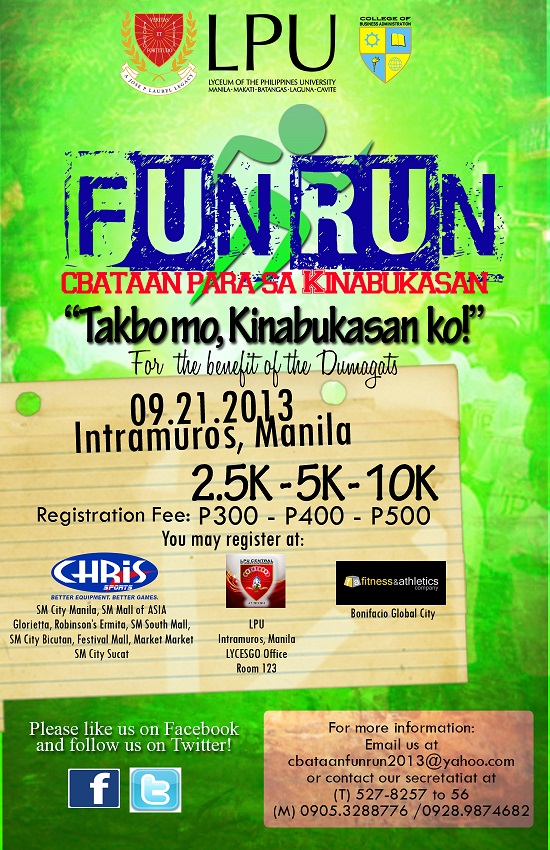 CBATAAN Fun Run 2013 is happening on September 21, 2013 at Intramuros Manila. The Lyceum of the Philippines University College of Business Administration Student Council (LPU-CBASC) organize a fun run to help other people.
