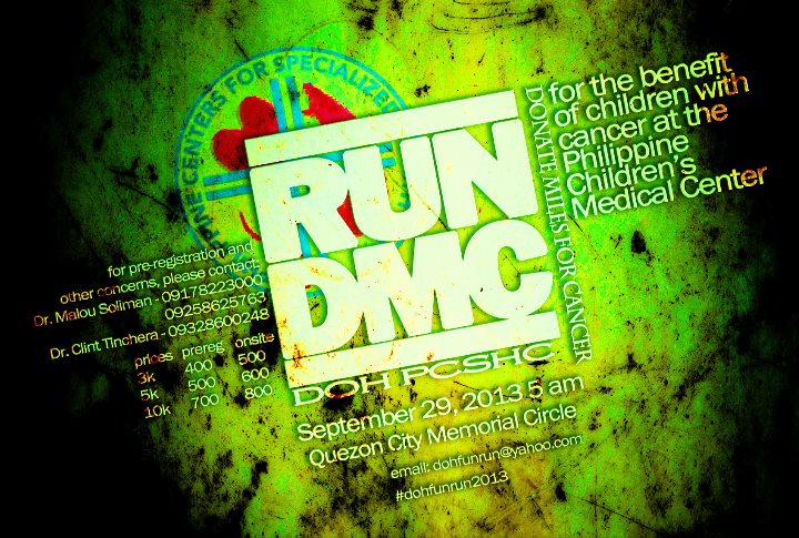 The Department of Health-Philippine Centers for Specialized Healthcare (DOH-PCSHC) is hosting Run DMC (Donate Miles for Cancer) 2013 on September 29, 2013, 5:00am at the Quezon City Memorial Circle. This is a fun run for the benefit of cancer patients of the Philippine Children’s Medical Center (PCMC).