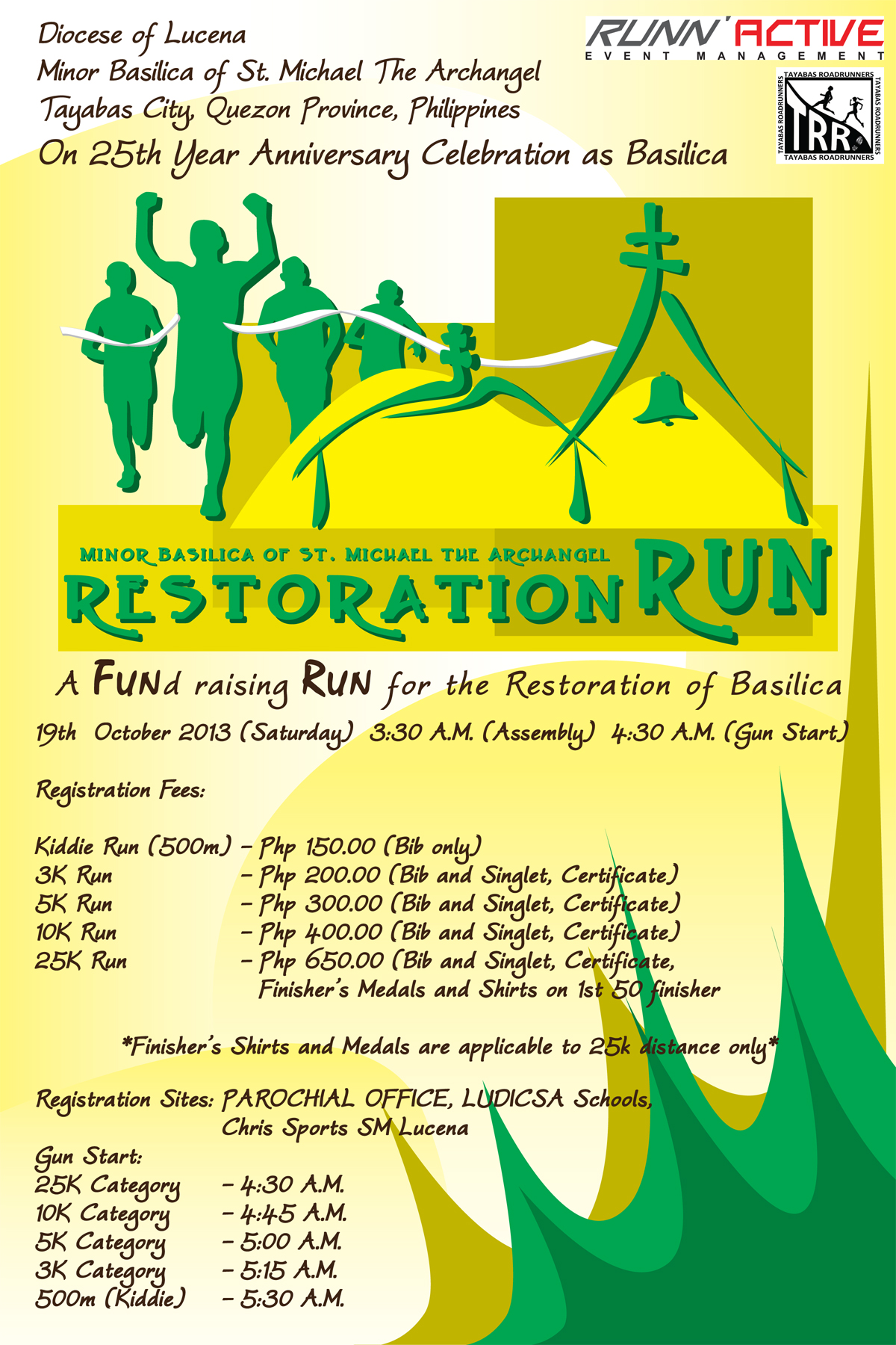 This is A FUNd raising RUN project of the Parish of the on-going repairs and restoration of one of the longest and largest church in the country, the four-century-old Minor Basilica of St. Michael the Archangel Parish in Tayabas City,Quezon Province.And the culminating activity for 25th Anniversary of the church as minor basilica as declared by the Vatican.