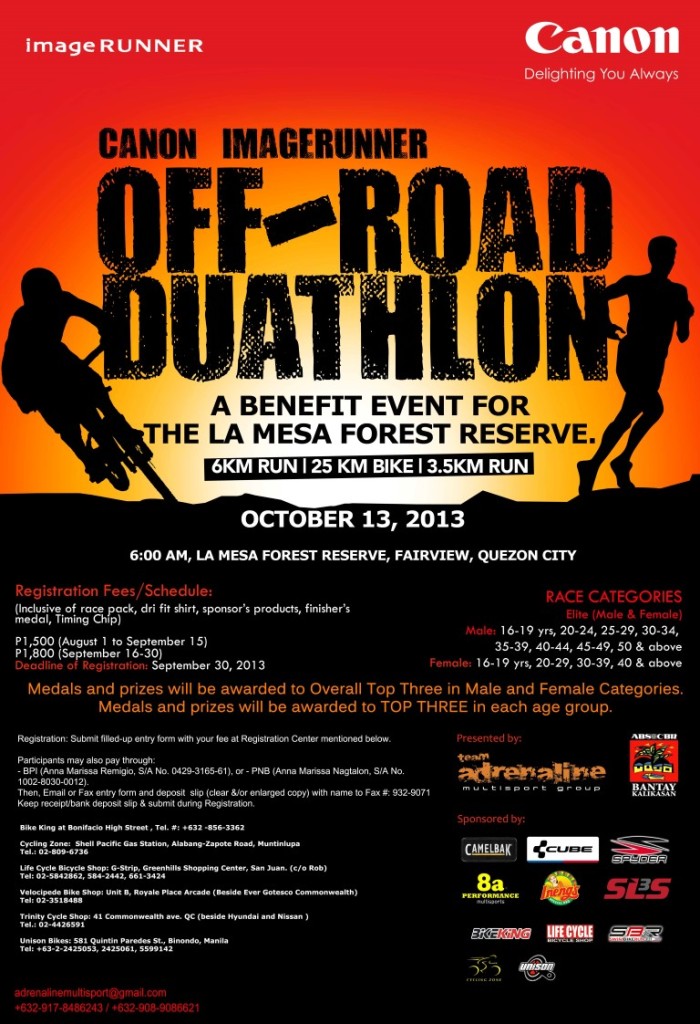 An off-road duathlon for the benefit of the La Mesa Forest Reserve, featuring a 6KM RUN, 25KM BIKE and 2.5KM RUN. Check it out!