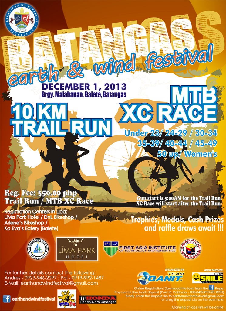 In celebration of Bisita Batangas and in cooperation of LiMA Hotel and First Asia Institute of Tanauan, present Batangas Earth and Wind Festival. As part of the celebration there will be 10Km Trail Run, Mountain Bike Race and Kite Flying Festival. It will happen in Brgy. Malabanan, Balete, Batangas on December 1, 2013.