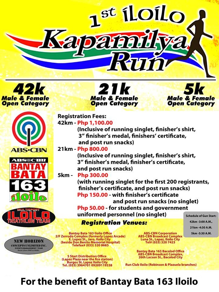 A fund raising project of Bantay Bata 163 (Iloilo) in cooperation with ABS CBN, City of Iloilo, Municipality of Pavia, Municipality of Leganes, Municipality of Zarraga, and MultiSport Iloilo Triathlon Team. The Marathon will be organized and managed by New Horizon Concepts Unlimited, Inc.