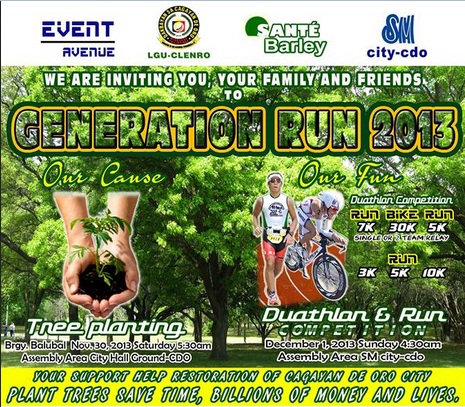 This December 1, 2013, Generation Run 2013 is happening at SM City Cagayan De Oro. Its a Walk, Run, Bike, (Duathlon) and Plant event for the restoration of Cagayan de Oro, an urban tree planting program. Check out details below.
