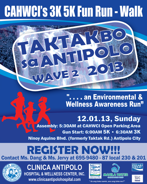 Taktakbo sa Antipolo Wave 2 2013 will be happening on December 1, 2013 at Clinica Antipolo Hospital & Wellness Center Inc. Open Parking Area. This event is an environmental & wellness awareness run. Save the date!