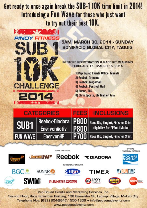 Get ready to once again break the SUB-1 10K time limit in 2014! Pinoy Fitness and Pep Squad Events is back! This time at an earlier time slot to make sure that the rain can’t stop your training!