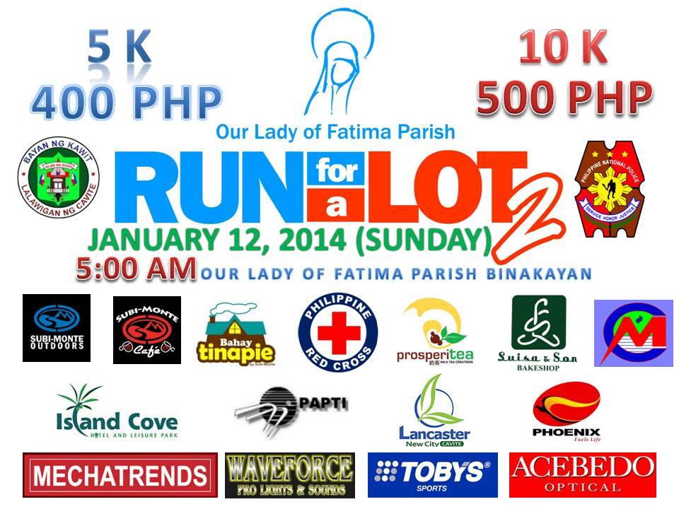 Our Lady of Fatima Parish Pastoral is inviting everyone to join “Run for a Lot 2” happening on January 12, 2014 at Our Lady of Fatima Parish. This event is for the benefit of the victims of Typhoon Yolanda in Visayas.