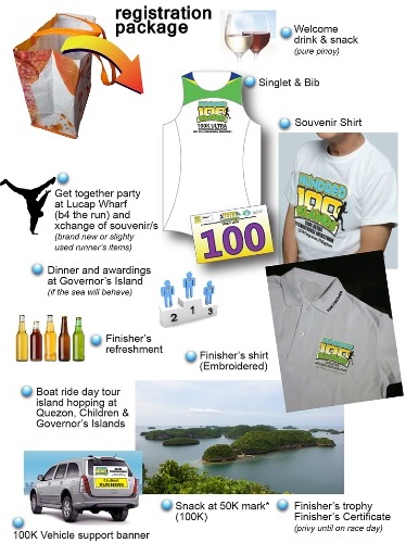 – Inclusive of Singlet and Bib, Finisher’s shirt, Finisher’s trophy, Finisher’s Certificate, Snack at 50K mark (100K), Finisher’s refreshment and snack, Vehicle support banner