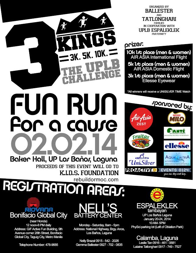 A Fun Run organized by Singer/Artist Karylle where proceeds of the race will go to the K.I.D.S. Foundation, 3 KINGS Fun Run is happening on February 2, 2014 at the Baker Hall, UP Los Banos, Laguna. Sign up and help today!